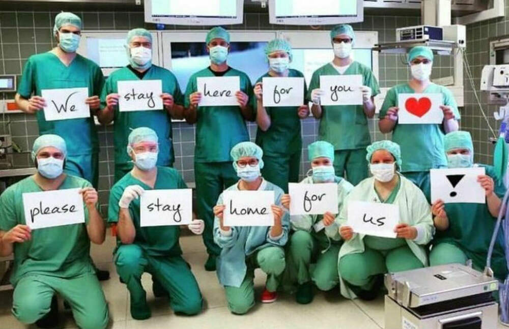 Доктора сделали общий снимок в халатах и масках с листами бумаги, на которых написали свое послание миру. ... Далее